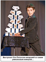 "ОТБОР УЧАСТНИКОВ КОНКУРСА В РИМЕ ПРОХОДИЛ НА ПРОТЯЖЕНИИ 6 МЕСЯЦЕВ, - продолжает Сос Петросян-старший. - В проекте участвовало порядка 3 тысяч иллюзионистов из 60 стран. В полуфинале осталось лишь 70 из 10 стран, в том числе из Японии, США, Китая, Великобритании, Кореи. Мой внук показал мастерство микромагии престидижитации (вид иллюзионизма) с игральными картами и завоевал I место. Отмечу, что международный конкурс в Риме будет показан по итальянскому телеканалу Canal 5 в октябре 2012 года."