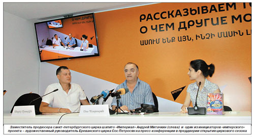 В армянскую столицу приехал цирк, причем не простой, а один из известнейших в России – санкт-петербургский цирк шапито «Империал». Это первый визит знаменитой цирковой труппы в Закавказский регион, что стало возможным благодаря поддержке Министерства культуры Армении, мэрии Еревана, посольства РФ в РА и?Российского центра науки и?культуры в?Ереване. Как отметил художественный руководитель Ереванского цирка и один из инициаторов «имперского» проекта Сос Петросян, переговоры о турне российских артистов в Армению велись достаточно долго, поскольку решалось множество вопросов как организационного, так и технического характера. В частности, надо было предусмотреть дислокацию и возможности строительства огромной конструкции традиционного шатра на 800 мест, а также продумать, где и как разместить артистов и животных, прибывших к нам большим караваном из восьми фур.