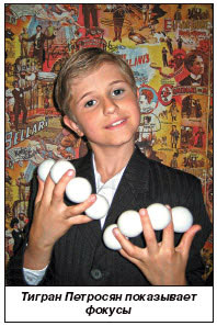 "ОТБОР УЧАСТНИКОВ КОНКУРСА В РИМЕ ПРОХОДИЛ НА ПРОТЯЖЕНИИ 6 МЕСЯЦЕВ, - продолжает Сос Петросян-старший. - В проекте участвовало порядка 3 тысяч иллюзионистов из 60 стран. В полуфинале осталось лишь 70 из 10 стран, в том числе из Японии, США, Китая, Великобритании, Кореи. Мой внук показал мастерство микромагии престидижитации (вид иллюзионизма) с игральными картами и завоевал I место. Отмечу, что международный конкурс в Риме будет показан по итальянскому телеканалу Canal 5 в октябре 2012 года."